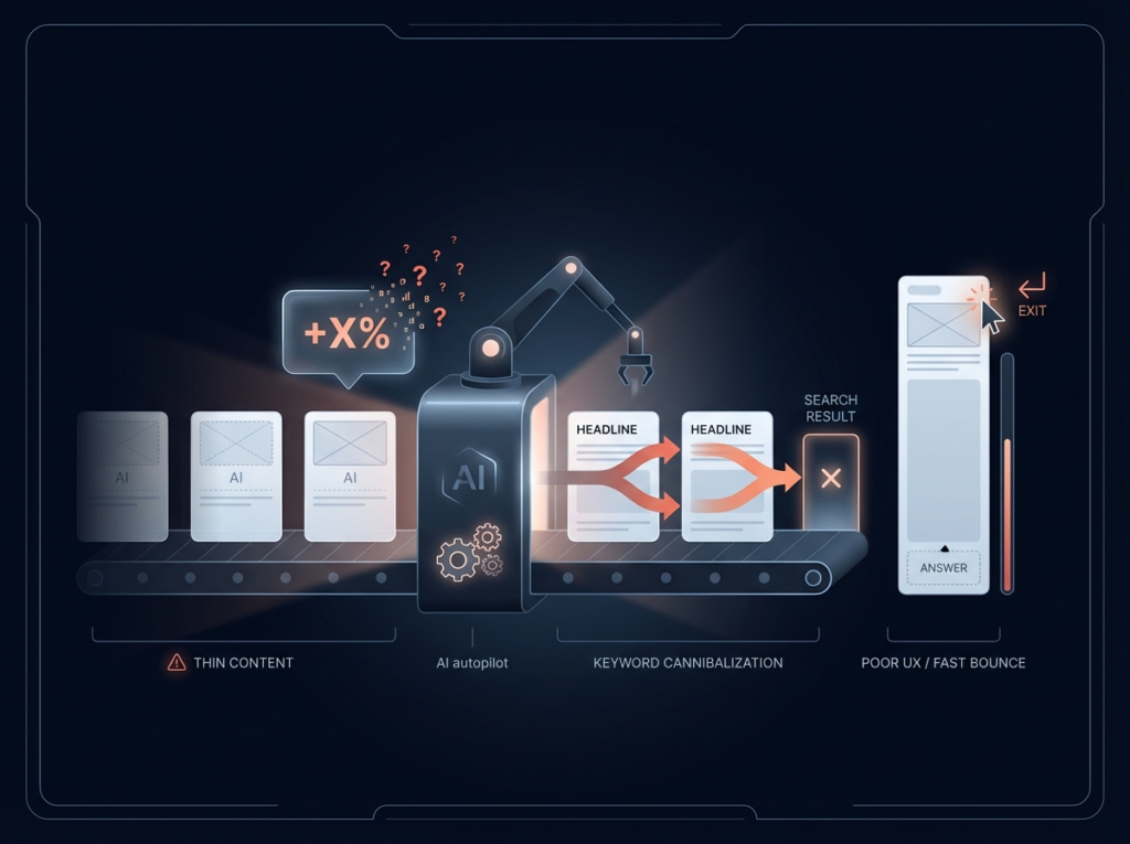 Найгірший сценарій — коли ШІ використовують як конвеєр для тонкого контенту без новизни, без прикладів і без фактчеку. Такий текст може виглядати пристойно, але не дає читачеві відчуття реальної користі: він не бачить ані практичних кроків, ані пояснення “чому так”, ані деталей, які відрізняють експертний матеріал від шаблону. У підсумку сторінка або не піднімається у видачі, або збирає слабкі поведінкові сигнали, бо люди швидко закривають її після першого скролу.